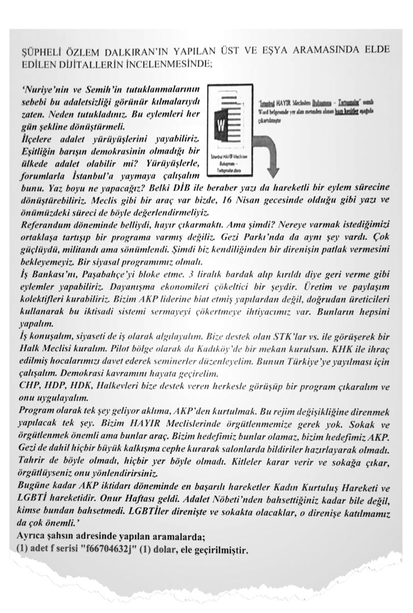 B�y�kada'da yakalanan aktivistlerin toplant�s�nda h�k�meti paralel meclis kurarak sokak olaylar� ve ekonomiyi ��kerterek devirme plan� haz�rlan�yordu. Toplant�ya kat�lan �sve� Uyruklu Ali Ghravi'nin �zerinden ��kan haritada T�rkiye'yi b�lm��ler... Adalar Cumhuriyet Ba�savc�l���n�n talimat�yla B�y�kada'da g�zalt�na al�nan 2'si yabanc� uyruklu 10 ��pheliden 6�s�, "silahl� ter�r �rg�t�ne yard�m etmek" su�undan tutukland�, 4 ki�i ise adli kontrol �art�yla serbest b�rak�ld�. Bu arada B�y�kada�daki s�zde insan haklar� aktivistlerinin toplant�s�yla ilgili deh�et veren belgelere ula��ld�. Soros�un kurulu�lar�nda s�zde dan��manl�k yapan ve evindeki aramada �zlem Dalk�ran��n bilgisayar�nda toplant�n�n amac�n� en net �ekilde ortaya koyan ifadeler yer ald�. SOKA�A D�KME PLANI -Referandum d�neminde belliydi, hay�r ��karmakt�. Ama �imdi? Nereye varmak istedi�imizi ortakla�a tart���p bir programa varm�� de�iliz. Gezi Park�'nda da ayn� �ey vard�. �ok g��l�yd�, militand� ama s�n�mlendi. �imdi biz kendili�imizden bir direni�in patlak vermesini bekleyemeyiz. Bir siyasal program�m�z olmal�. "EKONOM�Y� ��KERTEL�M" -Dayan��ma ekonomileri ��kertici bir �eydir. �retim ve payla��m kolektifleri kurabiliriz. Bizim AKP liderine biat etmi� yap�lardan de�il, do�rudan �reticileri kullanarak bu iktisadi sistemi sermayeyi ��kertmeye ihtiyac�m�z var. MECL�S �A�RISI -�� konu�al�m, siyaseti de i� olarak alg�layal�m. Bize destek olan STK'lar vs. ile g�r��erek bir Halk Meclisi kural�m. Pilot b�lge olarak da Kad�k�y'de bir mekan kurulsun. Bilgisayardan ��kan belgeyi G�ne� gazetesi yay�nlad�; ![]() T�RK�YE'Y� B�LM��LER Cumhurba�kan� Erdo�an'�n B�y�kada'da yap�lan toplant�yla ilgili a��klamas�nda 'masan�n �st�nde ne t�r haritalar, ne t�r projeler oldu�unu polisimiz tespit etti' dedi�i harita ortaya ��kt�. T�rkiye'nin b�l�nm�� halinin oldu�u harita, toplant�ya kat�lan �sve� Uyruklu Ali Ghravi'nin �zerinden ��kt��� ��renildi. T�RK�YE'N�N G�NDEM�NE OTURMU�TU Uluslararas� Af �rg�t� ile Helsinki Yurtta�lar Derne�i, �nsan Haklar� G�ndemi ve E�it Haklar ��in �zleme Dernekleri'nin B�y�kada'da bir otelde yapt�klar� toplant� T�rkiye'nin g�ndemine oturmu�tu. Toplant�n�n polis taraf�ndan bas�lmas�n�n ard�ndan 10 aktivist g�zalt�na al�n�rken �nceki g�n 6's� 'ter�r �rg�t�ne yard�m etmekten' dolay� tutuklanm��t�. ERDO�AN'IN BAHSETT��� HAR�TA ORTAYA �IKTI Cumhurba�kan� Recep Tayyip Erdo�an, B�y�kada'daki toplant�yla ilgili 'masan�n �st�nde ne t�r haritalar ne t�r projeler oldu�unu polisimiz tespit etti" diyerek �zerinde �al���lan bir harita oldu�una i�aret etmi�ti. Cumhurba�kan� Erdo�an'�n bahsetti�i haritan�n toplant�ya kat�lan �sve� Uyruklu Ali Ghravi'nin �zerinden ��kan ve T�rkiye'nin Do�u b�lgelerinin b�l�nm�� oldu�u bir harita oldu�u ortaya ��kt�. ![]() B�L�NM�� HAR�TA �nsan Haklar� E�itmeni ve bili�im uzman� oldu�unu ifade eden Ghravi'den ele ge�en haritada, T�rkiye Cumhuriyeti devleti s�n�rlar� i�inde yer alan Do�u ve G�neydo�u B�lgesinin b�y�k bir b�l�m�n�n �izilen s�n�rla, Kuzey Irak ve Suriye'de K�rt k�kenlilerin ya�ad��� alanlarla birle�tirildi�i g�r�l�yor. Yine ayn� Haritada �ran s�n�rlar� i�erisinde kalan belirli b�lgeler de bu harita i�inde tek s�n�r olarak yer al�yor. M�T'E SUNULAN BELGE Toplant�da g�zalt�na al�nanlar aras�nda olan Helsinki Yurtta�lar Derne�i �yesi Nalan Erkem'den ��kan belgede ise FET� ter�r �rg�t� soru�turmas�nda tutuklanan Bedriye ��tar Tarhanl� ile defalarca g�r��t��� ortaya ��kt�. Ele ge�irilen dijital malzemeler aras�nda delil olarak yer alan bir belgede ise M�T taraf�ndan TBMM Ara�t�rma Komisyonuna 2012 y�l�nda gizli ibaresiyle g�nderilen bir belge yer ald�. Af �rg�t� T�rkiye Direkt�r� �dil Eser'in telefon ve bilgisayar�nda yap�lan incelemelerde ise, Af �rg�t�'ne �ye olmak isteyen PKK bir doktorun mesajlar� bulundu. Mesajda, bu ki�inin uzun zamand�r PKK �yesi oldu�u, Kuzey Irak'ta cephede bulundu�u ve Af �rg�t�'ne katk� sa�lamak istedi�i yer al�yor. Bu haber 9024 defa okunmu�tur.