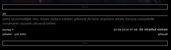 Rehinelerin serbest b�rak�lmas� t�m T�rkiye'yi sevince bo�arken, Ek�i S�zl�k'te yap�lan bir yorumlar tepki �ekti. "Bir istanbul esmasi" nickli s�zl�k yazar� serbest b�rak�lan 49 rehine olay�yla ilgili olarak "Zerre sevinmedi�im olay, ke�ke sadece kafalar� gelseydi de ter�r �rg�t�ne arkan� dayay�p osmanl�c�l�k oynaman�n cezas�n� �ekseydi birileri" dedi.